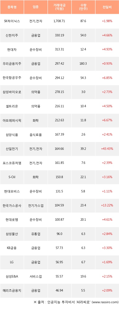 외국인 투자자의 순매수 상위 20개 종목은 SK하이닉스, 신한지주, 현대차, 우리금융지주, 한국항공우주, 삼성바이오로직스, 셀트리온, 아모레퍼시픽, 삼양식품, 산일전기등이다.