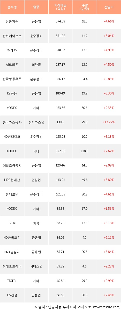 이날 기관 투자자가 순매수한 종목들 중에 신한지주, 한화에어로스페이스, 현대차 등은 전일 대비 주가가 상승했다.
