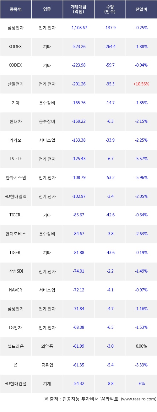기관 투자자의 순매도 상위 20개 종목은 삼성전자, KODEX 레버리지, KODEX 200, 산일전기, 기아, 현대차, 카카오, LS ELECTRIC, 한화시스템, HD현대일렉트릭등이다.