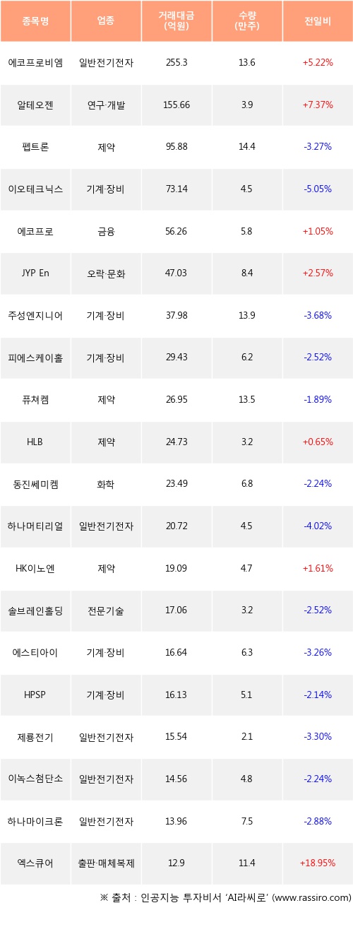 에코프로비엠, 알테오젠, 에코프로 등은 전일 대비 주가가 상승했고, 펩트론, 이오테크닉스, 주성엔지니어링 등은 주가가 하락했다.