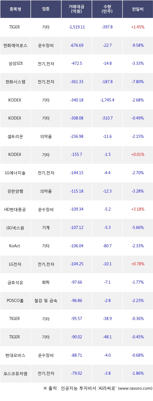 기관 투자자의 순매도 상위 20개 종목은 TIGER 200, 한화에어로스페이스, 삼성SDI, 한화시스템, KODEX 200선물인버스2X, KODEX 코스닥150레버리지, 셀트리온, KODEX CD금리액티브(합성), LG에너지솔루션, 유한양행등이다.