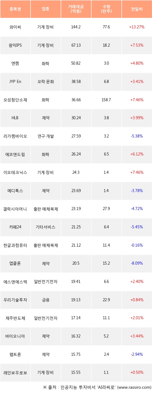 와이씨, 원익IPS, 엔켐 등은 전일 대비 주가가 상승했고, 리가켐바이오, 메디톡스, 갤럭시아머니트리 등은 주가가 하락했다.