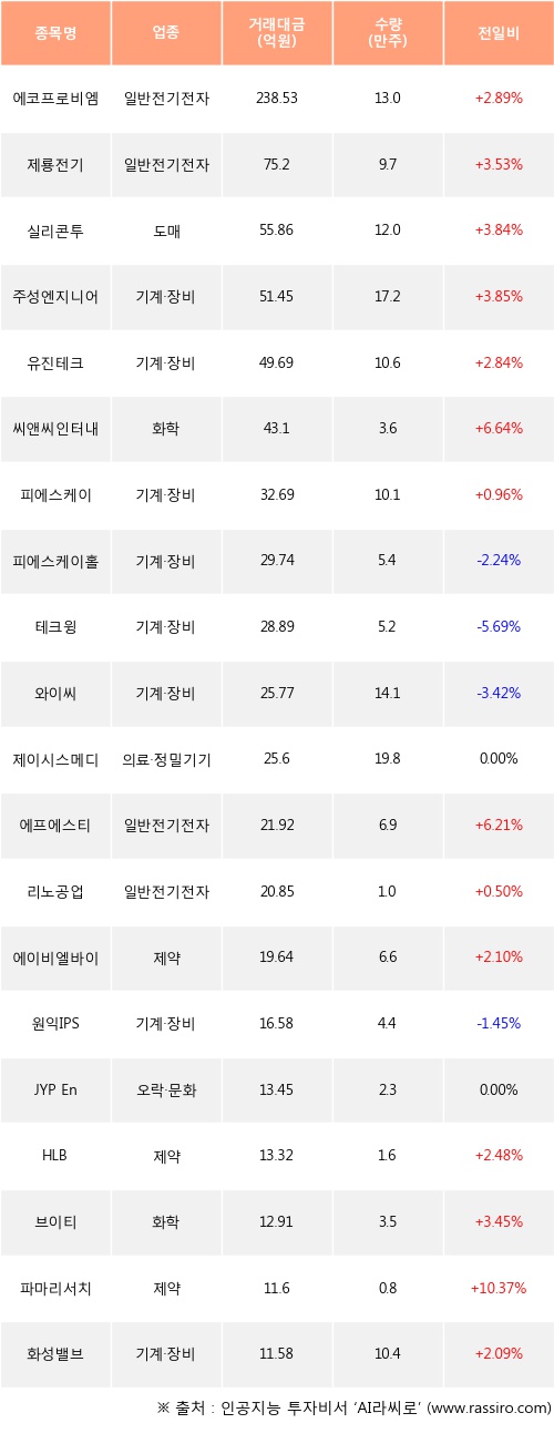 에코프로비엠, 제룡전기, 실리콘투 등은 전일 대비 주가가 상승했고, 피에스케이홀딩스, 테크윙, 와이씨 등은 주가가 하락했다.