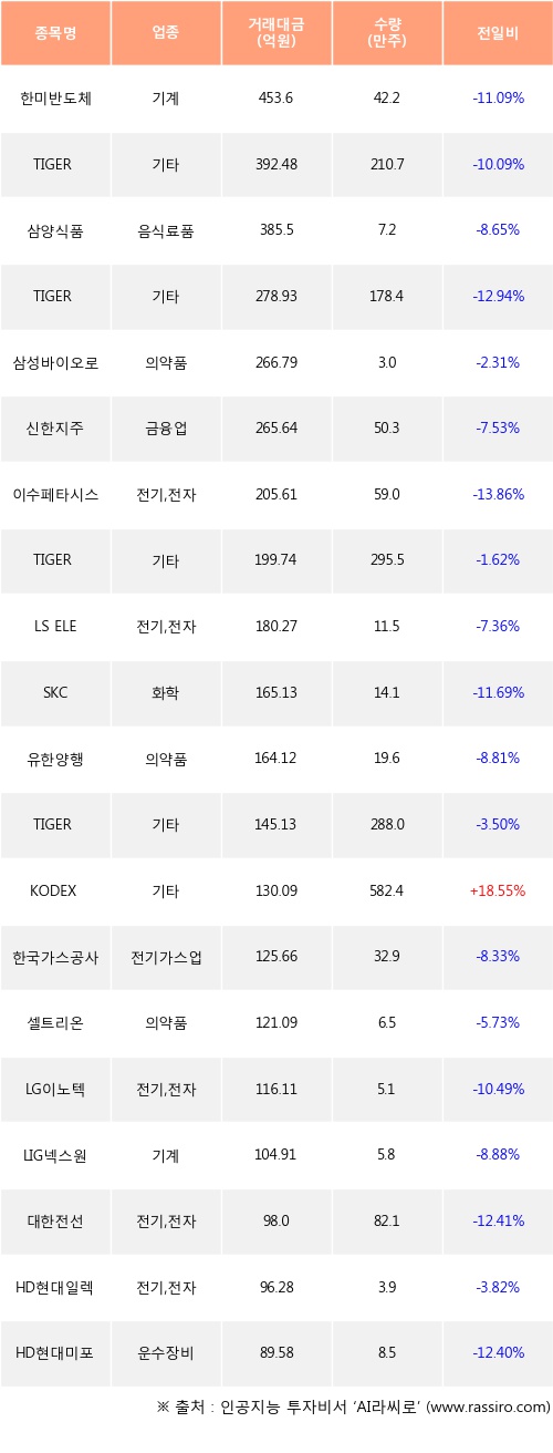외국인 투자자의 순매수 상위 20개 종목은 한미반도체, TIGER 미국테크TOP10 INDXX, 삼양식품, TIGER 미국필라델피아반도체나스닥, 삼성바이오로직스, 신한지주, 이수페타시스, TIGER 차이나전기차SOLACTIVE, LS ELECTRIC, SKC등이다.