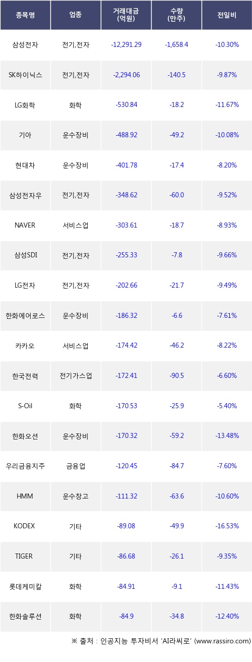 외국인 투자자의 순매도 상위 20개 종목은 삼성전자, SK하이닉스, LG화학, 기아, 현대차, 삼성전자우, NAVER, 삼성SDI, LG전자, 한화에어로스페이스등이다.