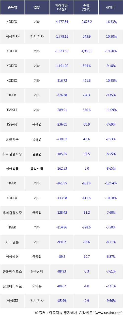 이날 기관 투자자가 순매도한 종목들 중에 KODEX 레버리지, 삼성전자, KODEX 코스닥150레버리지 등은 전일 대비 주가가 하락했다.