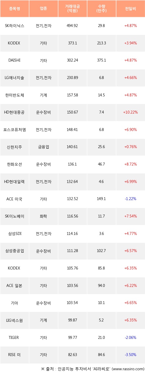 SK하이닉스, KODEX 레버리지, DAISHIN343 AI반도체&인프라액티브 등은 전일 대비 주가가 상승했고, ACE 미국30년국채액티브(H), TIGER 미국30년국채스트립액티브(합성 H), RISE 미국30년국채엔화노출(합성 H) 등은 주가가 하락했다.