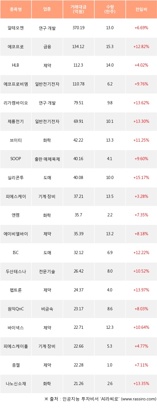 이날 기관 투자자가 순매수한 종목들 중에 알테오젠, 에코프로, HLB 등은 전일 대비 주가가 상승했다.