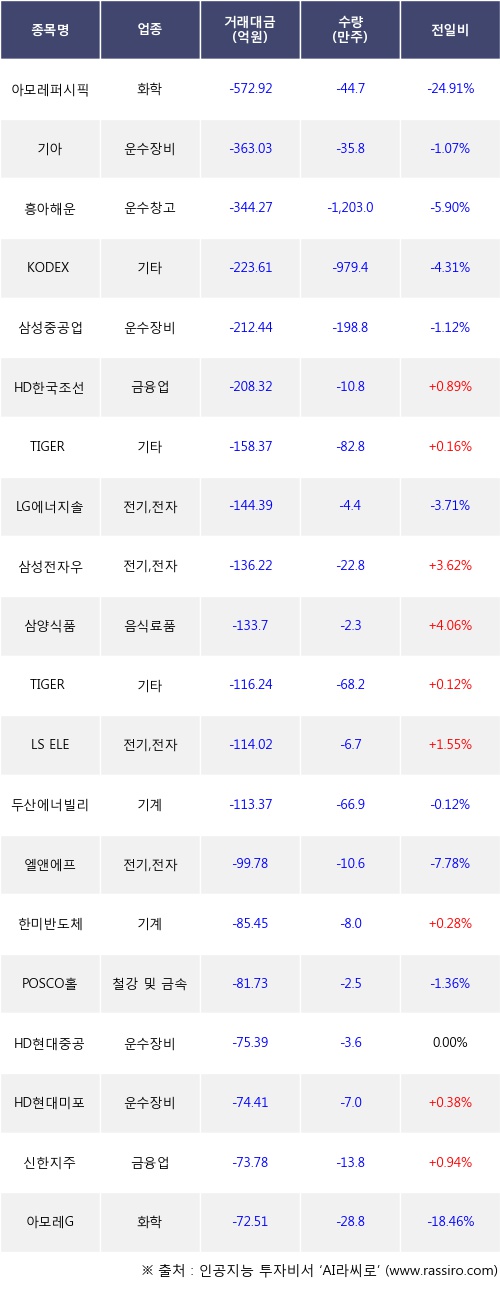 외국인 투자자의 순매도 상위 20개 종목은 아모레퍼시픽, 기아, 흥아해운, KODEX 200선물인버스2X, 삼성중공업, HD한국조선해양, TIGER 미국테크TOP10 INDXX, LG에너지솔루션, 삼성전자우, 삼양식품등이다.