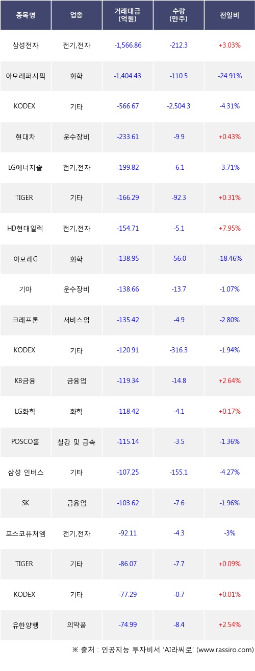 기관 투자자의 순매도 상위 20개 종목은 삼성전자, 아모레퍼시픽, KODEX 200선물인버스2X, 현대차, LG에너지솔루션, TIGER 미국S&P500, HD현대일렉트릭, 아모레G, 기아, 크래프톤등이다.