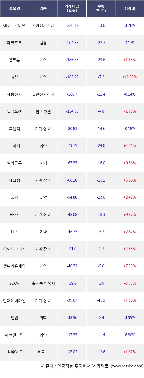 외국인 투자자의 순매도 상위 20개 종목은 에코프로비엠, 에코프로, 펩트론, 휴젤, 제룡전기, 알테오젠, 피엔티, 브이티, 실리콘투, 테크윙등이다.