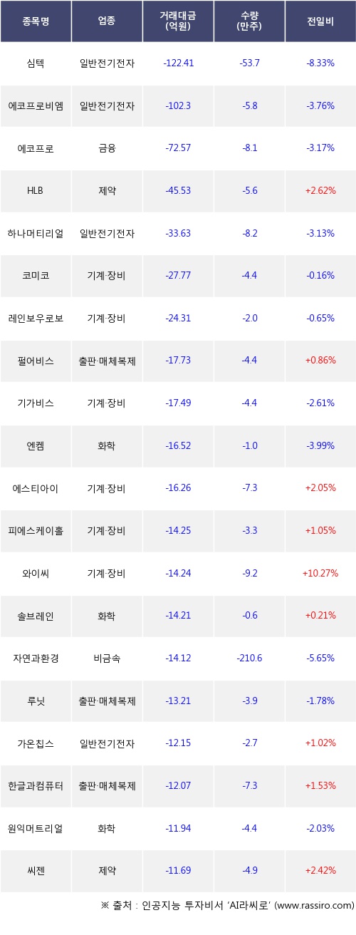 기관 투자자의 순매도 상위 20개 종목은 심텍, 에코프로비엠, 에코프로, HLB, 하나머티리얼즈, 코미코, 레인보우로보틱스, 펄어비스, 기가비스, 엔켐등이다.