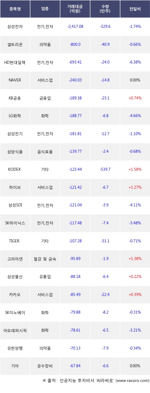 외국인 투자자의 순매도 상위 20개 종목은 삼성전자, 셀트리온, HD현대일렉트릭, NAVER, KB금융, LG화학, 삼성전기, 삼양식품, KODEX 200선물인버스2X, 하이브등이다.