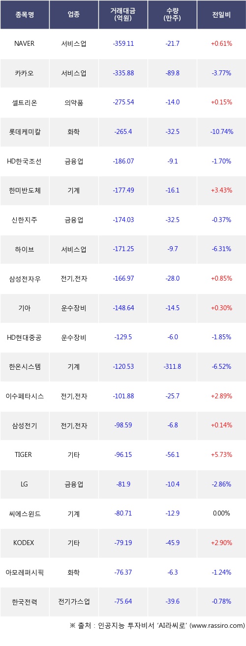 외국인 투자자의 순매도 상위 20개 종목은 NAVER, 카카오, 셀트리온, 롯데케미칼, HD한국조선해양, 한미반도체, 신한지주, 하이브, 삼성전자우, 기아등이다.