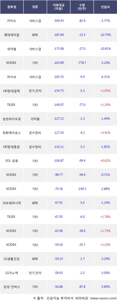 기관 투자자의 순매도 상위 20개 종목은 카카오, 롯데케미칼, 넷마블, KODEX 200선물인버스2X, 하이브, HD현대일렉트릭, TIGER 미국S&P500, 삼성바이오로직스, 한화에어로스페이스, HD현대중공업등이다.