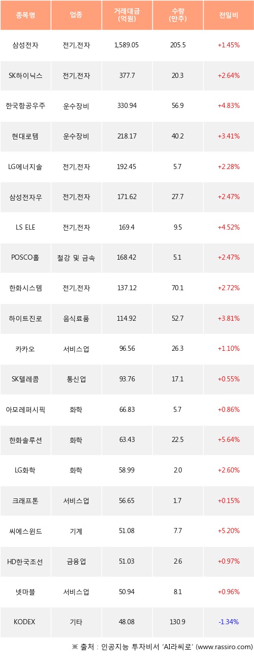 삼성전자, SK하이닉스, 한국항공우주 등은 전일 대비 주가가 상승했고, KODEX 코스닥150선물인버스 등은 주가가 하락했다.