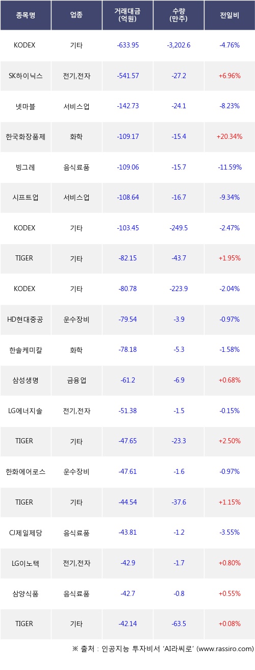기관 투자자의 순매도 상위 20개 종목은 KODEX 200선물인버스2X, SK하이닉스, 넷마블, 한국화장품제조, 빙그레, 시프트업, KODEX 인버스, TIGER 미국S&P500, KODEX 코스닥150선물인버스, HD현대중공업등이다.