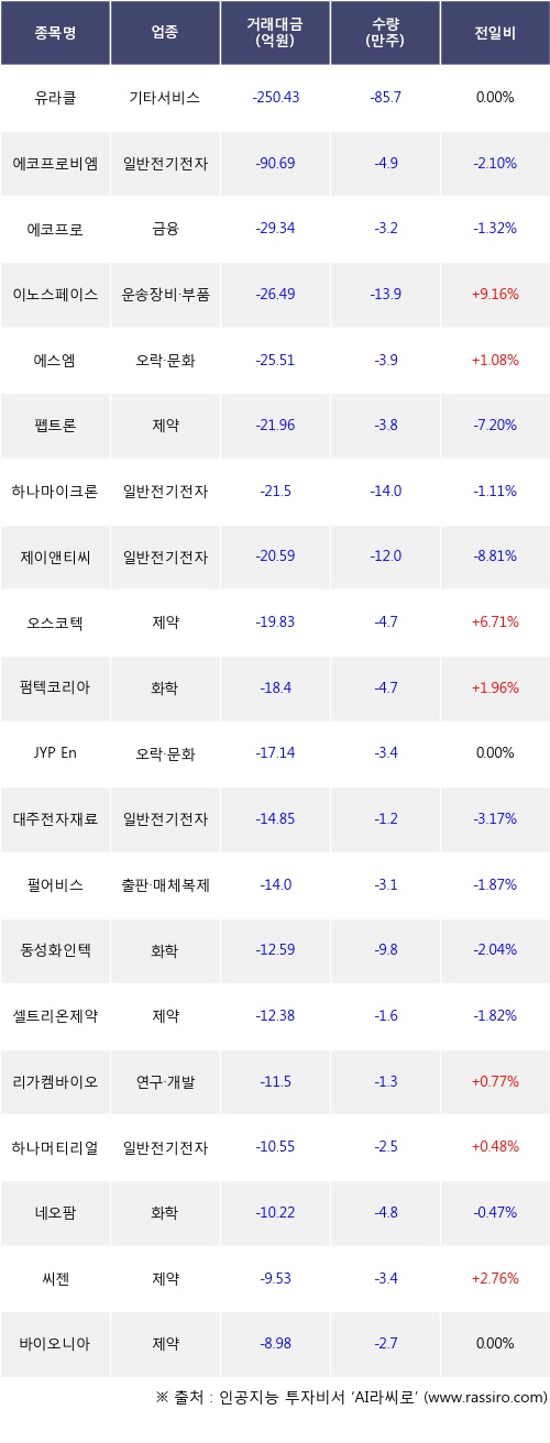 기관 투자자의 순매도 상위 20개 종목은 유라클, 에코프로비엠, 에코프로, 이노스페이스, 에스엠, 펩트론, 하나마이크론, 제이앤티씨, 오스코텍, 펌텍코리아등이다.
