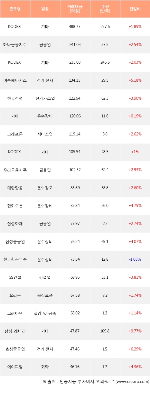 KODEX 레버리지, 하나금융지주, KODEX 코스닥150레버리지 등은 전일 대비 주가가 상승했고, 한국항공우주 등은 주가가 하락했다.