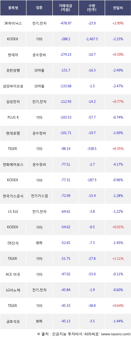 기관 투자자의 순매도 상위 20개 종목은 SK하이닉스, KODEX 200선물인버스2X, 현대차, 유한양행, 삼성바이오로직스, 삼성전자, PLUS K방산, 현대로템, TIGER 화장품, 한화에어로스페이스등이다.