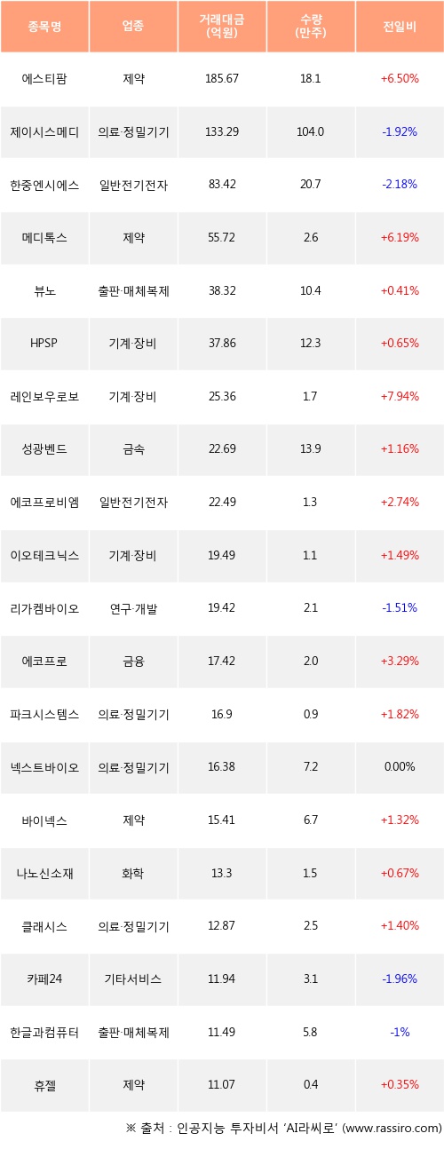 에스티팜, 메디톡스, 뷰노 등은 전일 대비 주가가 상승했고, 제이시스메디칼, 한중엔시에스, 리가켐바이오 등은 주가가 하락했다.