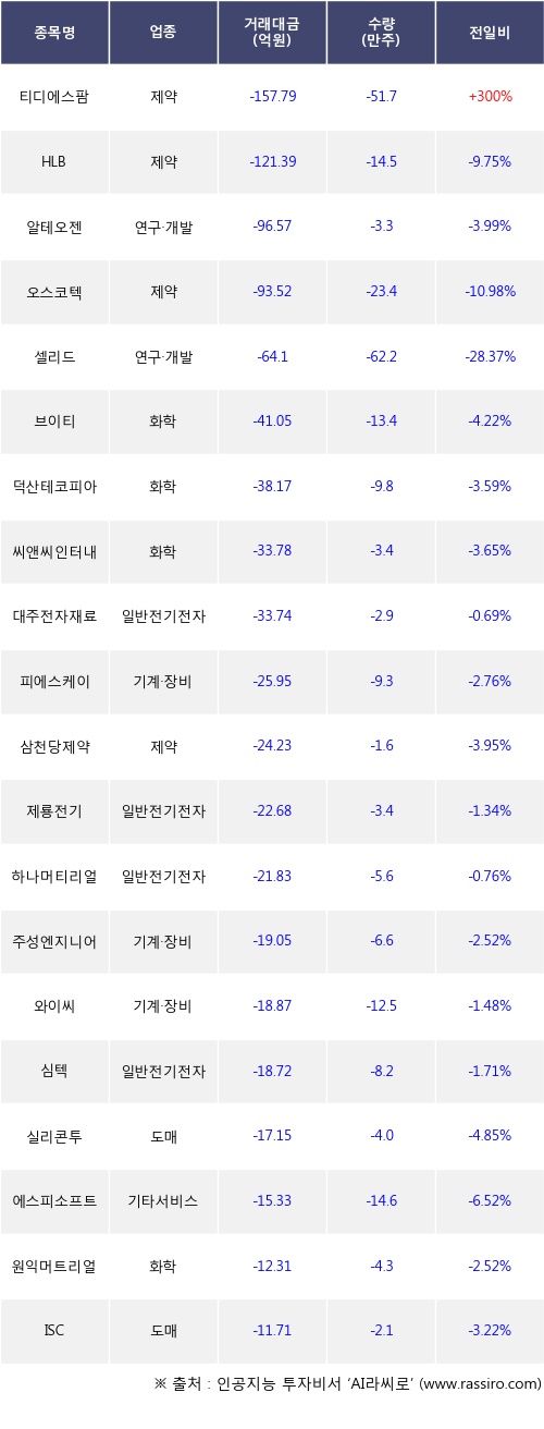 기관 투자자의 순매도 상위 20개 종목은 티디에스팜, HLB, 알테오젠, 오스코텍, 셀리드, 브이티, 덕산테코피아, 씨앤씨인터내셔널, 대주전자재료, 피에스케이등이다.