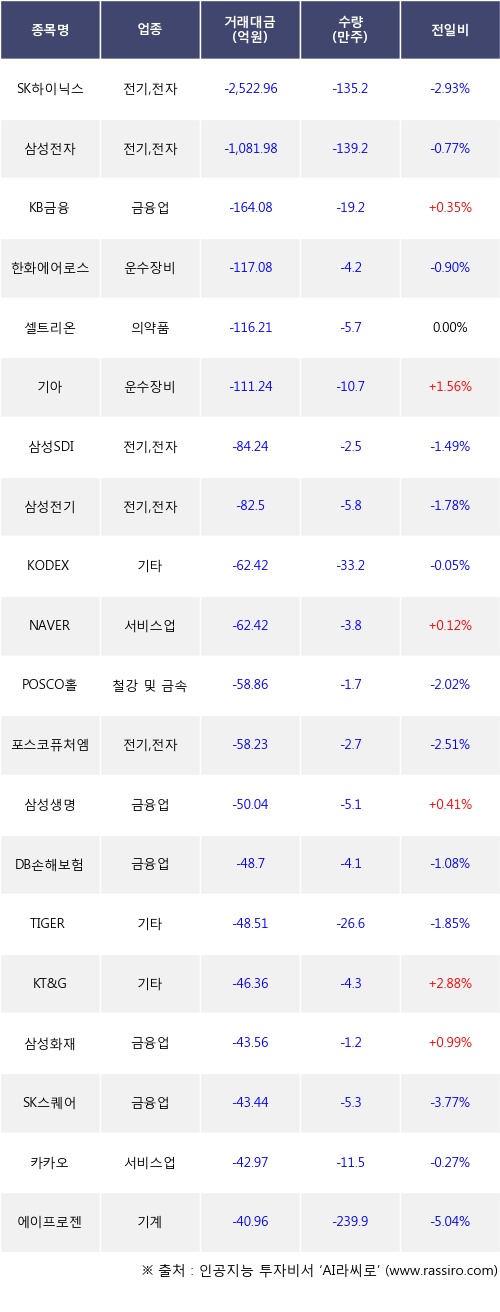 외국인 투자자의 순매도 상위 20개 종목은 SK하이닉스, 삼성전자, KB금융, 한화에어로스페이스, 셀트리온, 기아, 삼성SDI, 삼성전기, KODEX 레버리지, NAVER등이다.