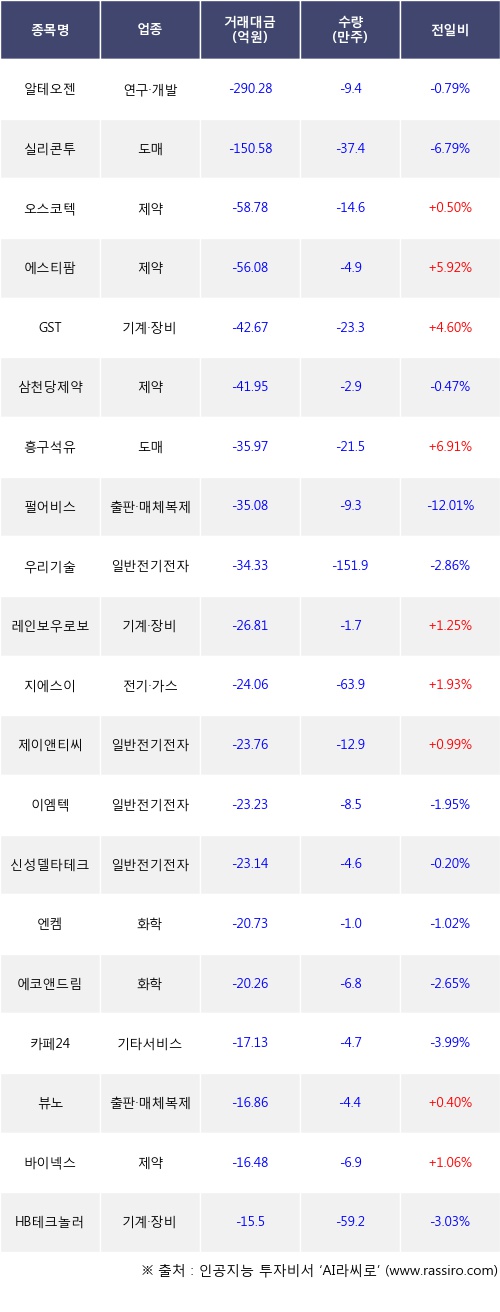 외국인 투자자의 순매도 상위 20개 종목은 알테오젠, 실리콘투, 오스코텍, 에스티팜, GST, 삼천당제약, 흥구석유, 펄어비스, 우리기술, 레인보우로보틱스등이다.