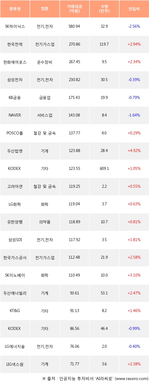한국전력, 한화에어로스페이스, POSCO홀딩스 등은 전일 대비 주가가 상승했고, SK하이닉스, 삼성전자, KB금융 등은 주가가 하락했다.