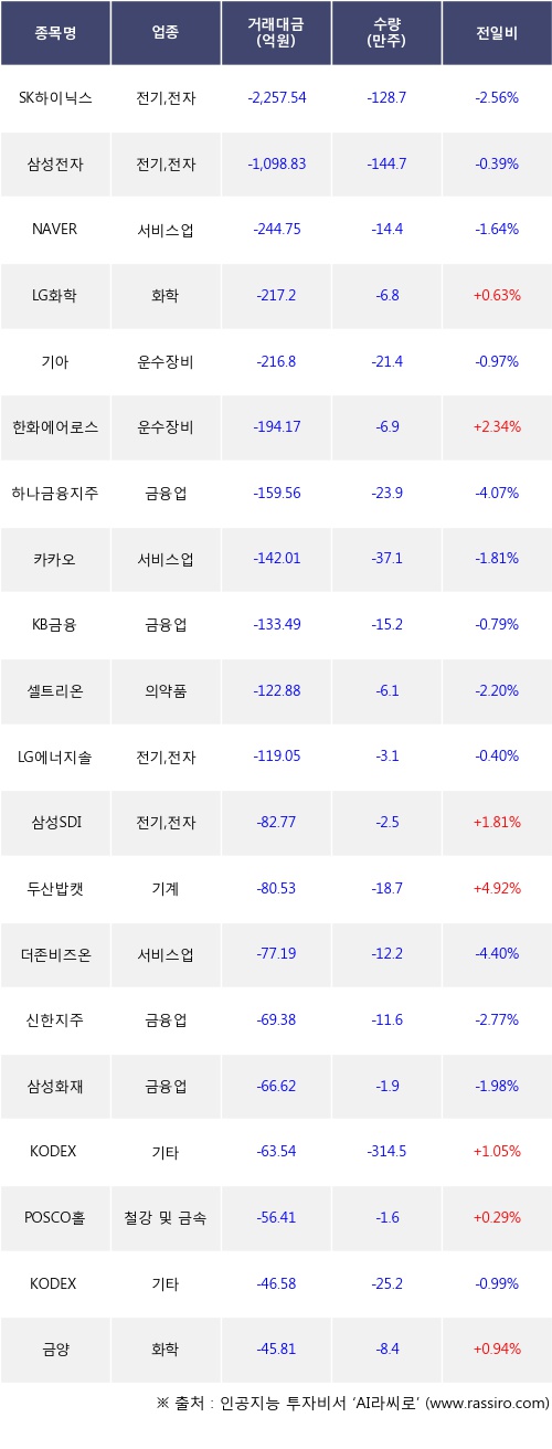 외국인 투자자의 순매도 상위 20개 종목은 SK하이닉스, 삼성전자, NAVER, LG화학, 기아, 한화에어로스페이스, 하나금융지주, 카카오, KB금융, 셀트리온등이다.