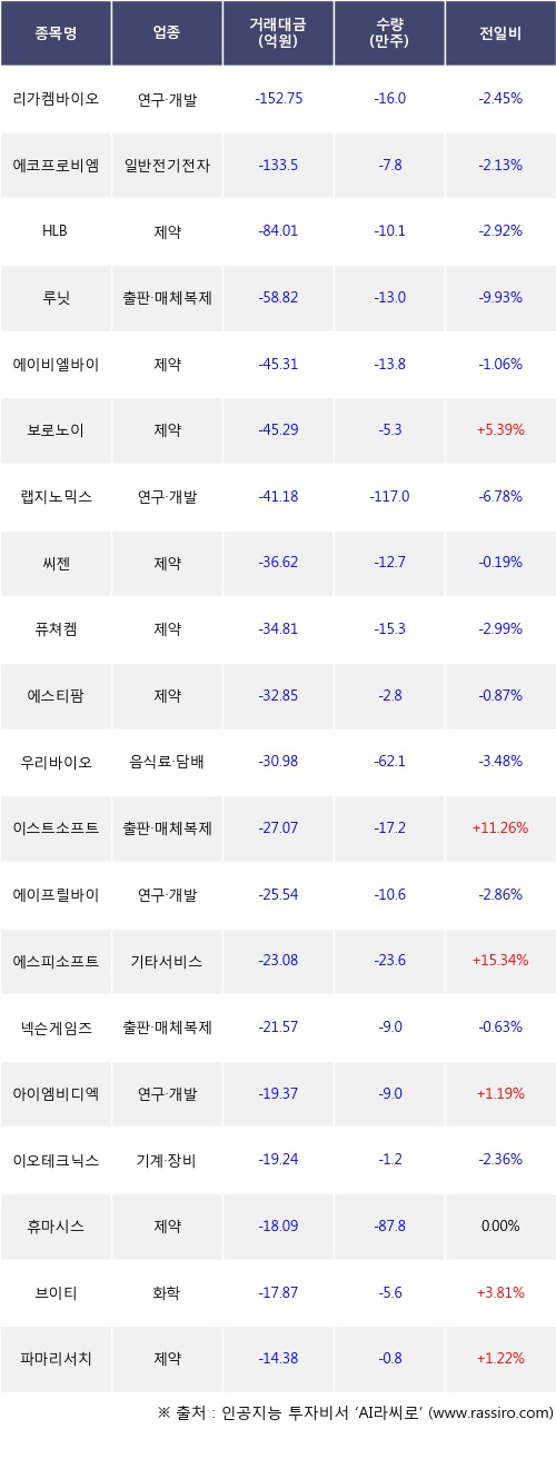 외국인 투자자의 순매도 상위 20개 종목은 리가켐바이오, 에코프로비엠, HLB, 루닛, 에이비엘바이오, 보로노이, 랩지노믹스, 씨젠, 퓨쳐켐, 에스티팜등이다.