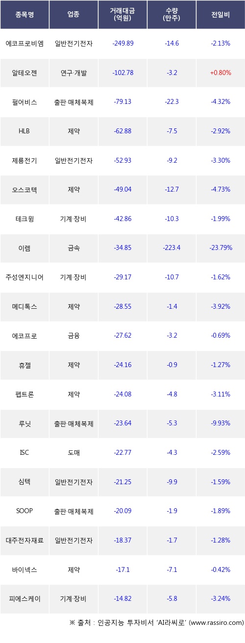 기관 투자자의 순매도 상위 20개 종목은 에코프로비엠, 알테오젠, 펄어비스, HLB, 제룡전기, 오스코텍, 테크윙, 이렘, 주성엔지니어링, 메디톡스등이다.