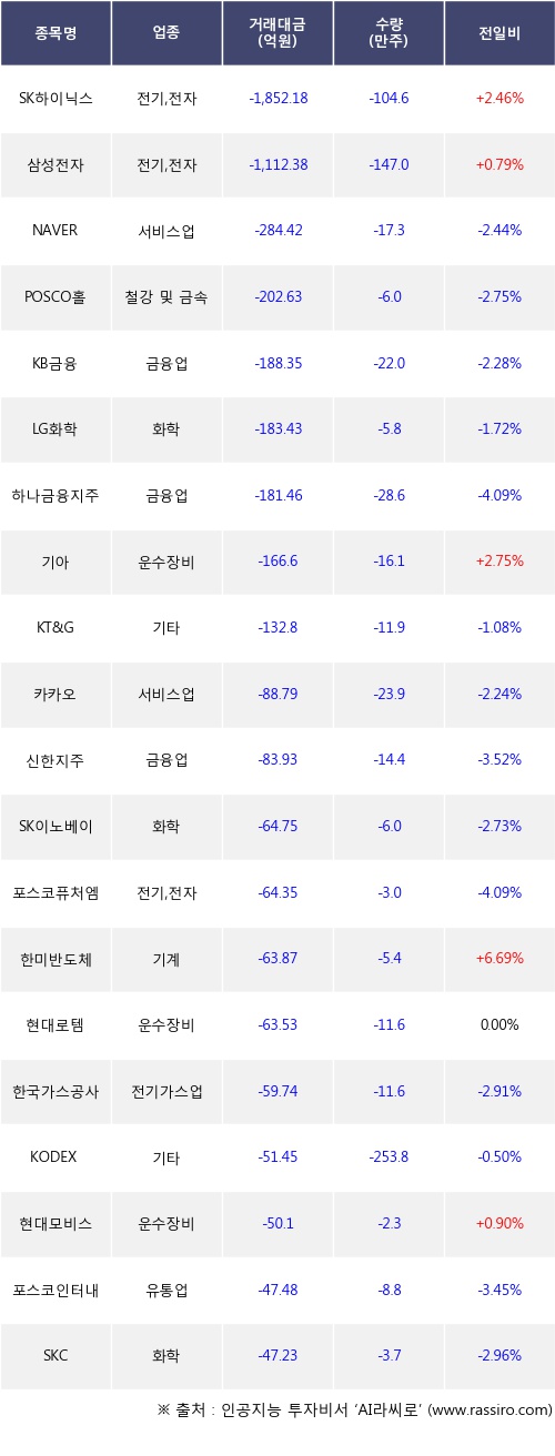 외국인 투자자의 순매도 상위 20개 종목은 SK하이닉스, 삼성전자, NAVER, POSCO홀딩스, KB금융, LG화학, 하나금융지주, 기아, KT&G, 카카오등이다.