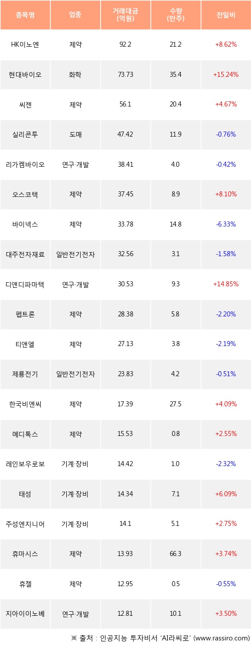 외국인 투자자의 순매수 상위 20개 종목은 HK이노엔, 현대바이오, 씨젠, 실리콘투, 리가켐바이오, 오스코텍, 바이넥스, 대주전자재료, 디앤디파마텍, 펩트론등이다.