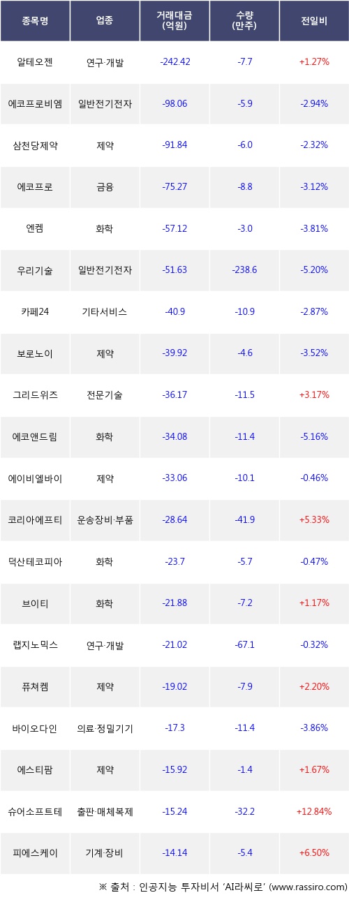 외국인 투자자의 순매도 상위 20개 종목은 알테오젠, 에코프로비엠, 삼천당제약, 에코프로, 엔켐, 우리기술, 카페24, 보로노이, 그리드위즈, 에코앤드림등이다.
