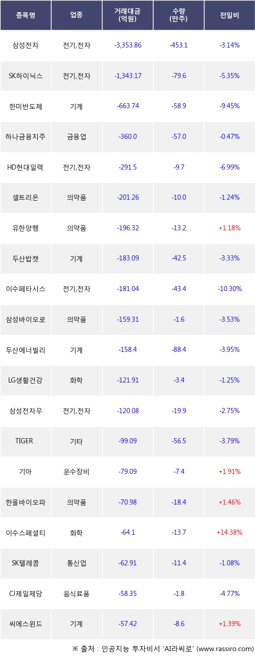 외국인 투자자의 순매도 상위 20개 종목은 삼성전자, SK하이닉스, 한미반도체, 하나금융지주, HD현대일렉트릭, 셀트리온, 유한양행, 두산밥캣, 이수페타시스, 삼성바이오로직스등이다.