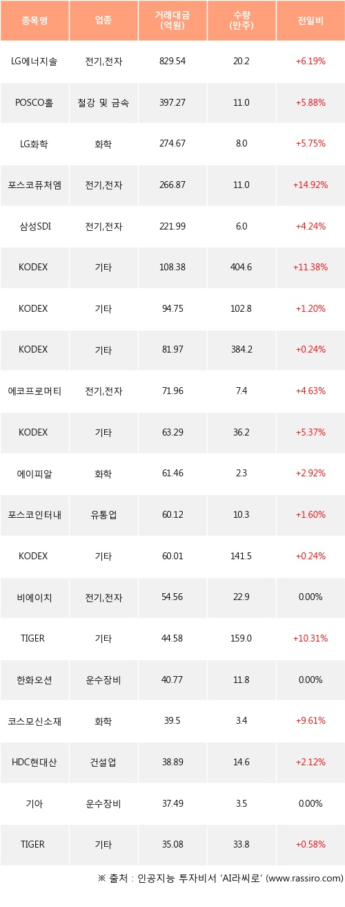 이날 기관 투자자가 순매수한 종목들 중에 LG에너지솔루션, POSCO홀딩스, LG화학 등은 전일 대비 주가가 상승했다.