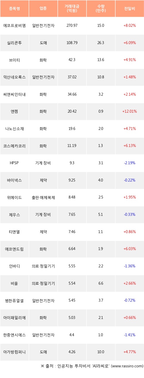 에코프로비엠, 실리콘투, 브이티 등은 전일 대비 주가가 상승했고, HPSP, 바이넥스, 제우스 등은 주가가 하락했다.