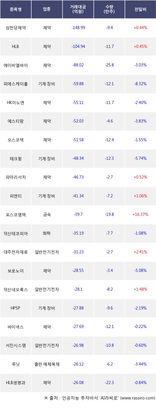 외국인 투자자의 순매도 상위 20개 종목은 삼천당제약, HLB, 에이비엘바이오, 피에스케이홀딩스, HK이노엔, 에스티팜, 오스코텍, 테크윙, 파마리서치, 피엔티등이다.