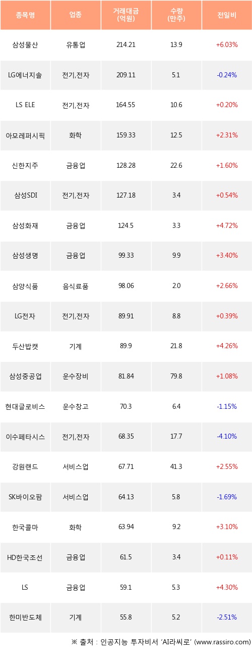 외국인 투자자의 순매수 상위 20개 종목은 삼성물산, LG에너지솔루션, LS ELECTRIC, 아모레퍼시픽, 신한지주, 삼성SDI, 삼성화재, 삼성생명, 삼양식품, LG전자등이다.