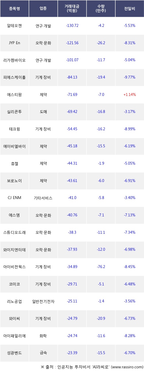 기관 투자자의 순매도 상위 20개 종목은 알테오젠, JYP Ent., 리가켐바이오, 피에스케이홀딩스, 에스티팜, 실리콘투, 테크윙, 에이비엘바이오, 휴젤, 보로노이등이다.