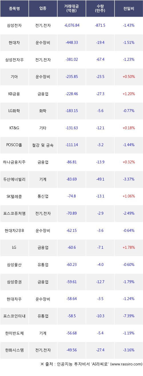 외국인 투자자의 순매도 상위 20개 종목은 삼성전자, 현대차, 삼성전자우, 기아, KB금융, LG화학, KT&G, POSCO홀딩스, 하나금융지주, 두산에너빌리티등이다.