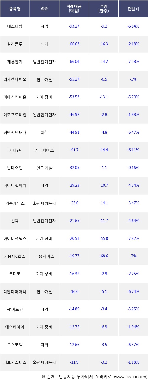 기관 투자자의 순매도 상위 20개 종목은 에스티팜, 실리콘투, 제룡전기, 리가켐바이오, 피에스케이홀딩스, 에코프로비엠, 씨앤씨인터내셔널, 카페24, 알테오젠, 에이비엘바이오등이다.