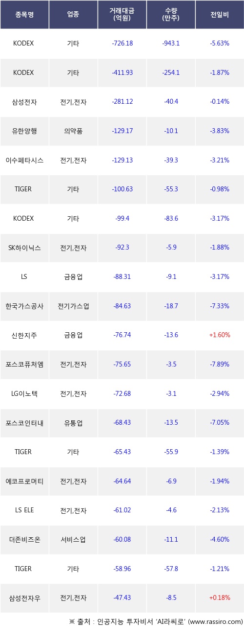 기관 투자자의 순매도 상위 20개 종목은 KODEX 코스닥150레버리지, KODEX 레버리지, 삼성전자, 유한양행, 이수페타시스, TIGER 미국S&P500, KODEX 코스닥150, SK하이닉스, LS, 한국가스공사등이다.