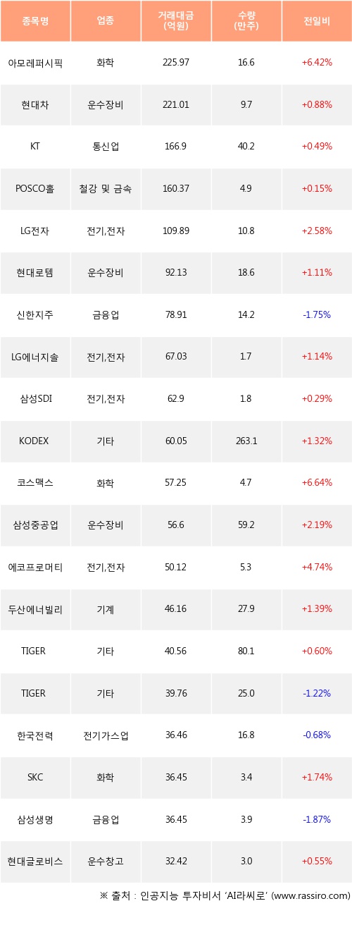 아모레퍼시픽, 현대차, KT 등은 전일 대비 주가가 상승했고, 신한지주, TIGER 미국필라델피아반도체나스닥, 한국전력 등은 주가가 하락했다.