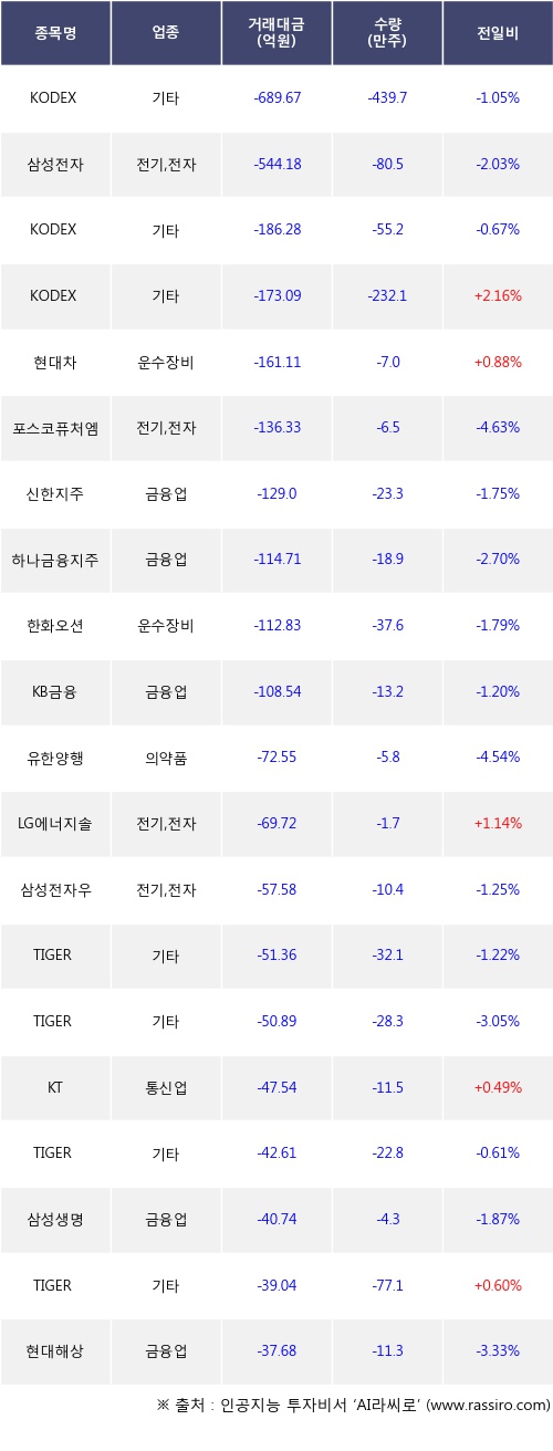 기관 투자자의 순매도 상위 20개 종목은 KODEX 레버리지, 삼성전자, KODEX 200, KODEX 코스닥150레버리지, 현대차, 포스코퓨처엠, 신한지주, 하나금융지주, 한화오션, KB금융등이다.
