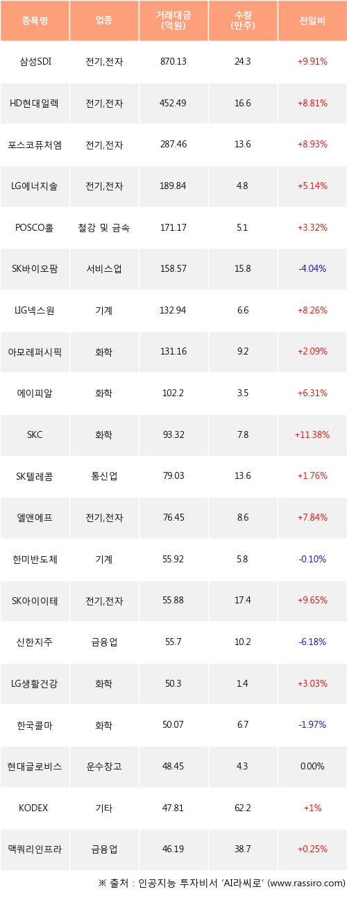 외국인 투자자의 순매수 상위 20개 종목은 삼성SDI, HD현대일렉트릭, 포스코퓨처엠, LG에너지솔루션, POSCO홀딩스, SK바이오팜, LIG넥스원, 아모레퍼시픽, 에이피알, SKC등이다.