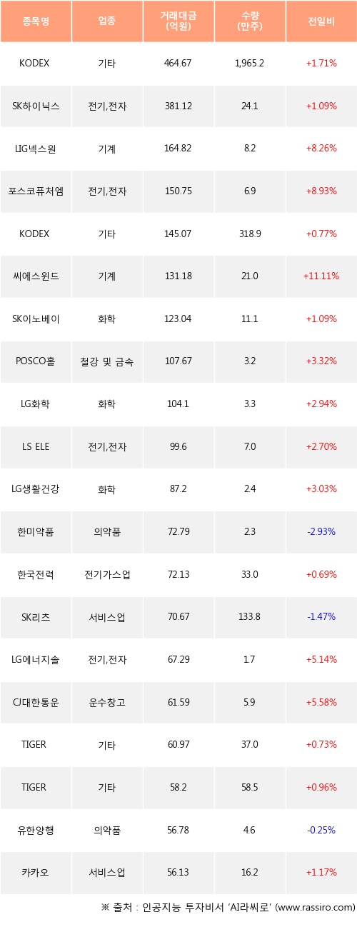 KODEX 200선물인버스2X, SK하이닉스, LIG넥스원 등은 전일 대비 주가가 상승했고, 한미약품, SK리츠, 유한양행 등은 주가가 하락했다.