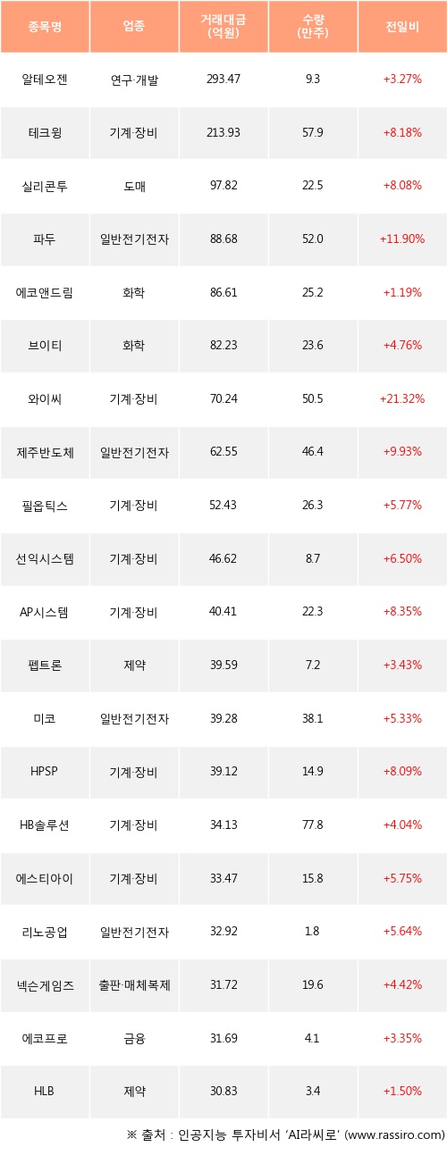 기관 투자자의 순매수 상위 20개 종목은 알테오젠, 테크윙, 실리콘투, 파두, 에코앤드림, 브이티, 와이씨, 제주반도체, 필옵틱스, 선익시스템등이다.