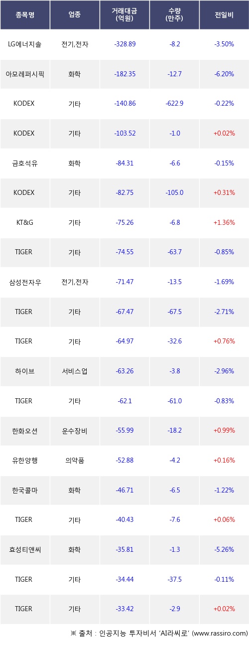 기관 투자자의 순매도 상위 20개 종목은 LG에너지솔루션, 아모레퍼시픽, KODEX 200선물인버스2X, KODEX CD금리액티브(합성), 금호석유, KODEX 코스닥150레버리지, KT&G, TIGER 미국배당다우존스, 삼성전자우, TIGER Fn반도체TOP10등이다.